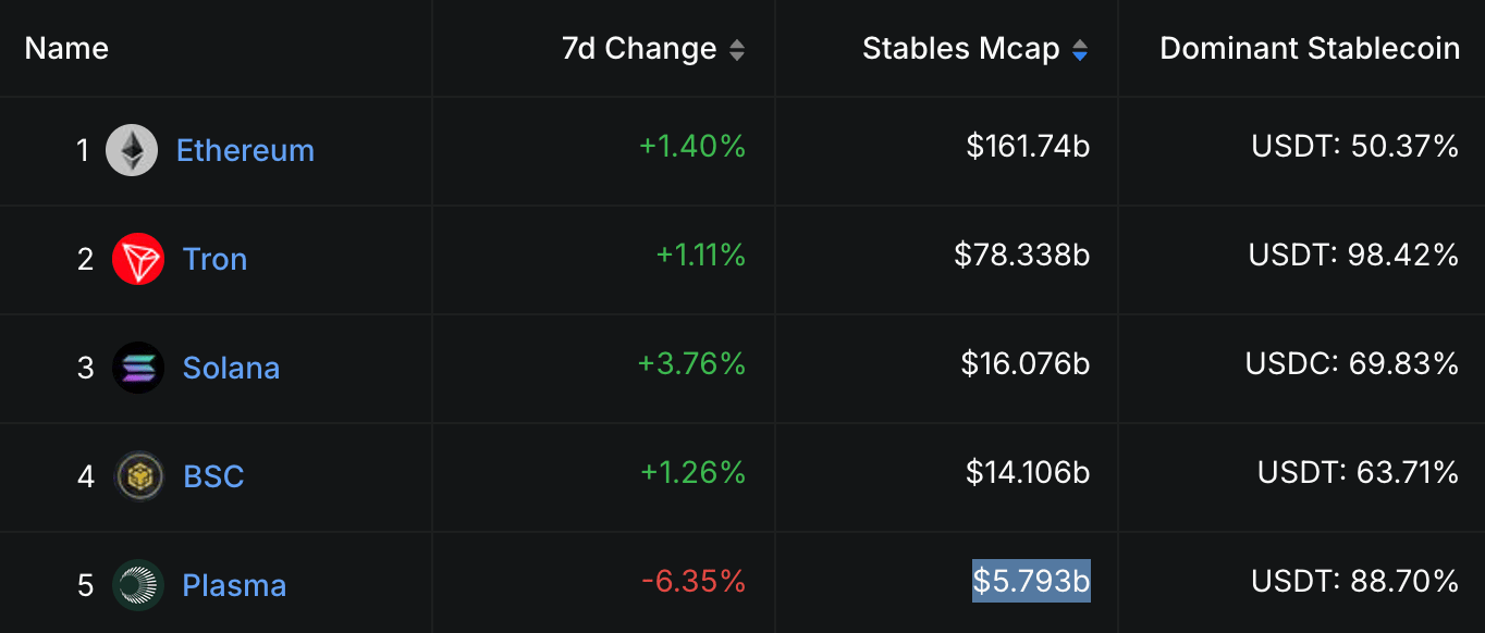And after just 3 weeks, Plasma is now the number 5 chain in terms of total stablecoin market cap ($5.793b):